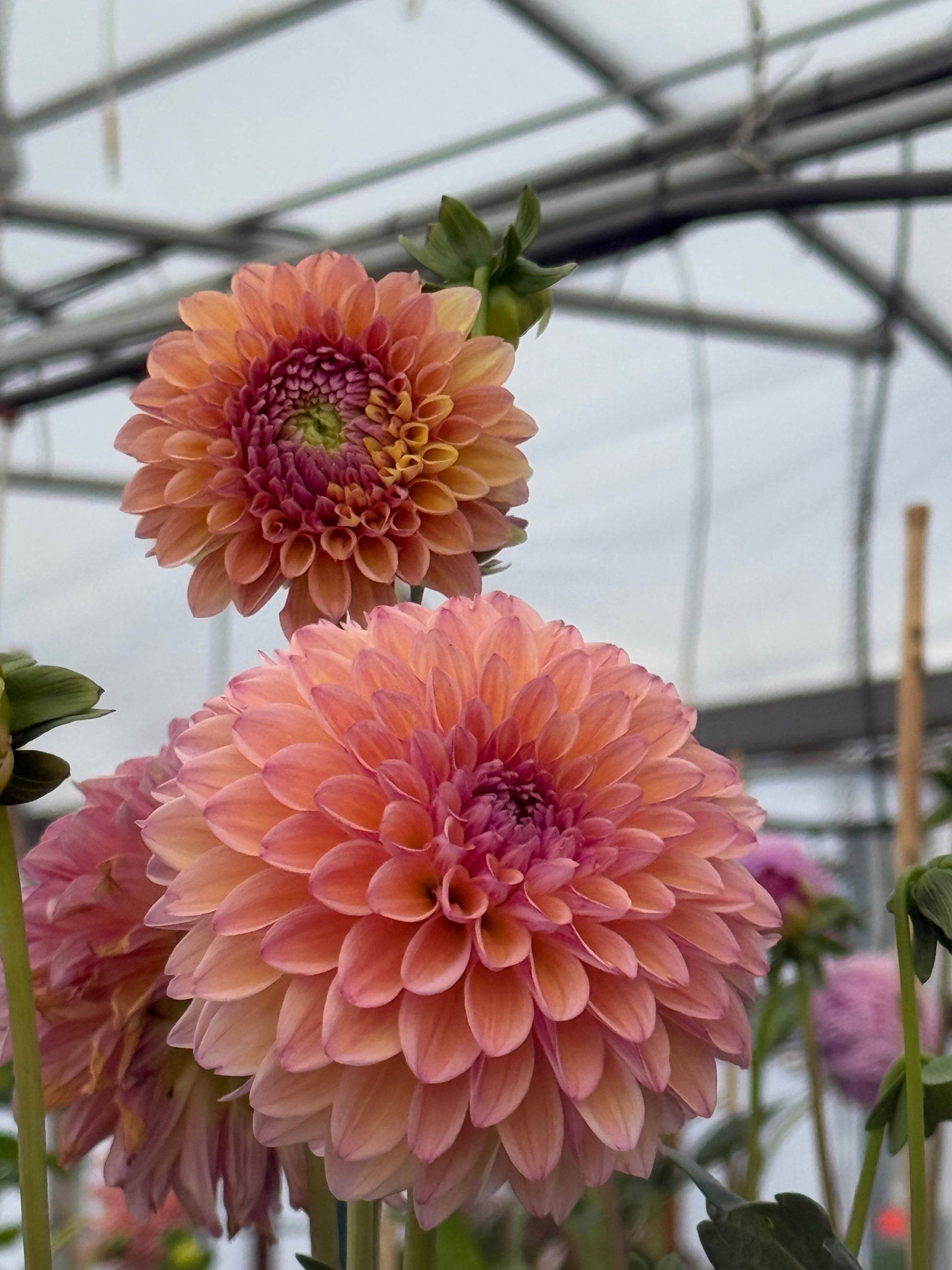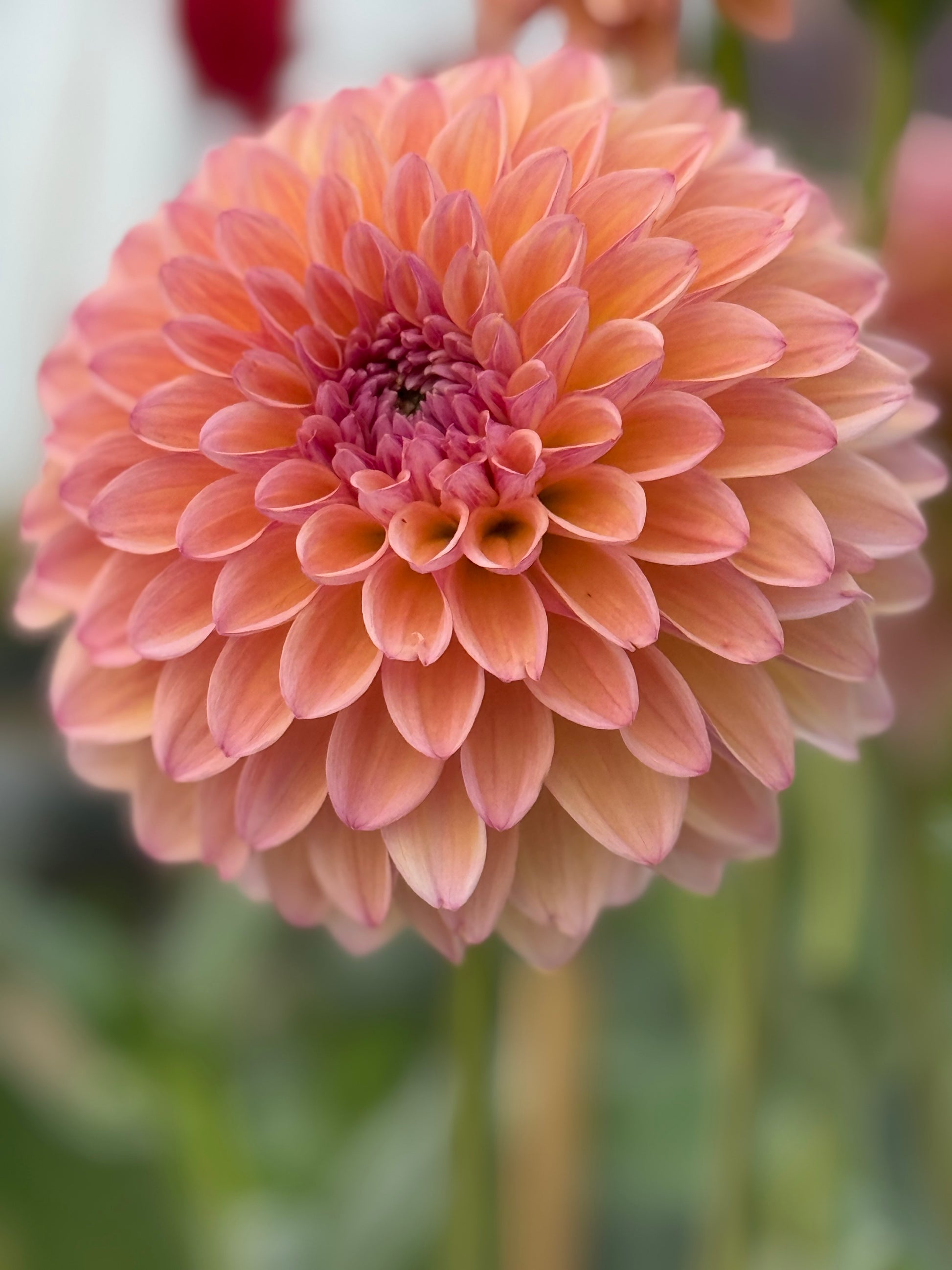 Bred by Lee Hemmings Carlton of Goldenrod Gardens, Punch Drunk Love is a dahlia that leans into romance with grace. Its ~3″ formal decorative blooms start with a peach foundation and carry a soft pink blush across the petals. The tips are whimsically split just a touch, giving it character and visual interest without losing composure.